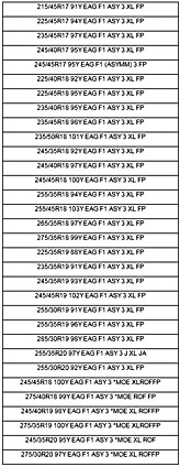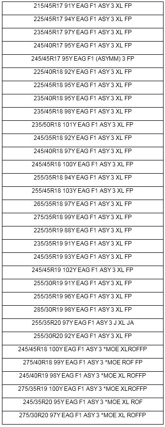 ยางอีเกิ้ลเอฟวัน แอสซิมเมทริค 3 มีด้วยกันถึง 32 ขนาด ตั้งแต่ขนาดความกว้างระหว่าง 17 - 20 นิ้ว ที่มีจำหน่ายในประเทศไทย มีดังนี้