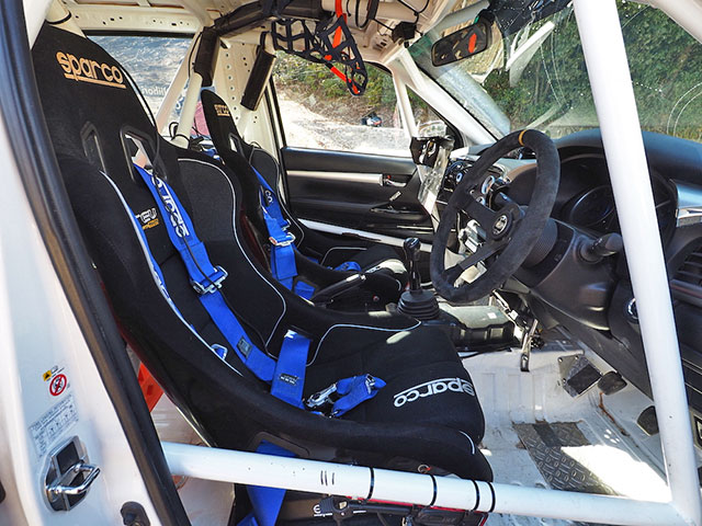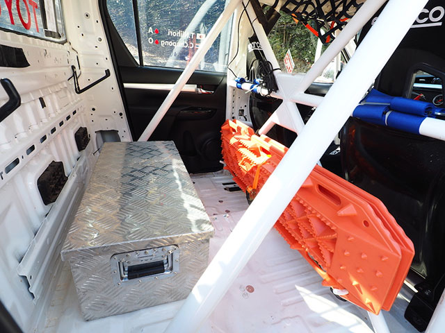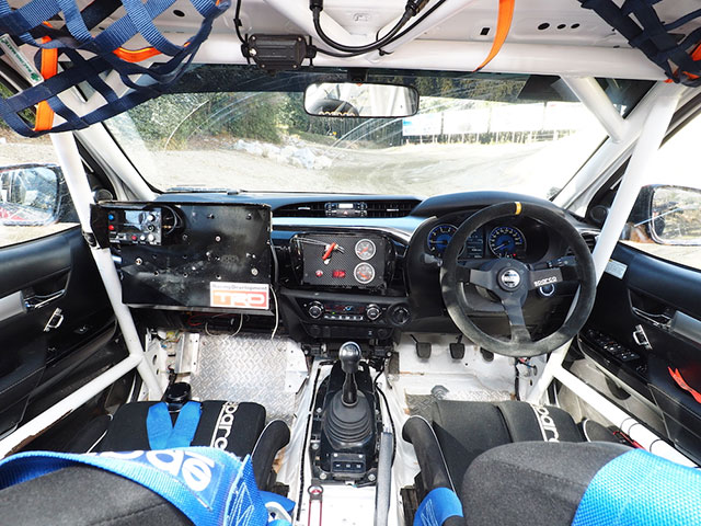 ห้องโดยสารภายในแต่งแบบสไตล์รถแข่ง อุปกรณ์ที่ไม่จำเป็นนั้นถอดออกไปเกือบหมด เพื่อลดน้ำหนักให้มากที่สุด แต่ยังคงระบบแอร์และกระจกไฟฟ้าเอาไว้ เพื่อความสบายในการขับขี่ เสริมความแข็งแกร่งด้วยโรลบาร์รอบคัน ติดตาข่ายด้านข้าง เบาะนั่งคู่หน้าแบบ Bucket Seat ของ Sparco ส่วนด้านหลังถอดเบาะออก แล้วติดตั้งกล่องเหล็ก ไว้สำหรับเก็บอุปกรณ์ที่จำเป็น และแผ่น Sand Ladder สีส้ม ที่ทำจากวัสดุเรซิ่น ใช้เวลารถตกหลุมทราย หรือติดหล่ม