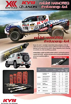 โช้คอัพ KYB รุ่น Lowfer Sports ที่ออกแบบให้คู่กับสปริงโหลดโดยเฉพาะ โดยมีการออกแบบโดยใช้โครงสร้างใหม่ เมื่อติดตั้งกับตัวรถจะทำให้ความสูงของตัวรถต่ำลง และที่สำคัญยังมีการออกแบบจุดศูนย์ถ่วงใหม่เพื่อให้ได้สมรรถนะการขับขี่ที่สูงขึ้น โดยเพิ่มความหนืดทั้งด้าน Rebound และ Compression ที่เหมาะสมกับการใช้งานที่ความเร็วสูง และการเข้าโค้งที่แม่นยำ แต่คงความนุ่มสบายนุ่มนวลโช้คอัพ KYB รุ่น KYB JAOS นำเทคโนโลยี HARMOFREQ สำหรับรถยกสูง ออฟโรด 4x4 โดยเฉพาะ ซึ่งเป็นเทคโนโลยีจาก KYB เพื่อมาใช้ในการควบคุมค่าความหนืดโดยการลดความถี่ที่เกิดจากการใช้งานย่านความเร็วสูง โดยใช้หลักการทำงานเดียวกับย่านความเร็วต่ำ เพื่อลดการสั่นสะเทือน และการ Generate ความหนืดที่เหมาะสม เพื่อการขับขี่ที่ดีและนุ่มนวลยิ่งขึ้น โดย HARMOFREQ Value สามารถปรับระดับความหนืด ได้ถึง 8 ระดับ