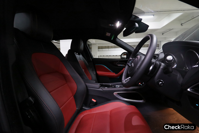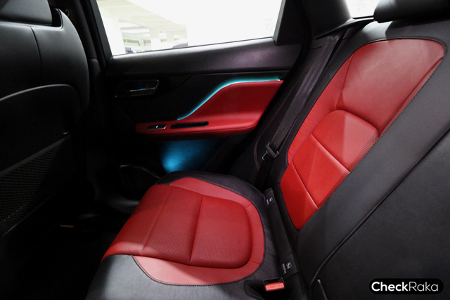 Jaguar F-Pace R-Sport นั้นออกแบบห้องโดยสารให้รองรับ 5 ที่นั่ง พร้อมด้วยฟังก์ชั่นการใช้งานที่ครบครัน เบาะนั่งเป็นเบาะหนังแท้ทรงสปอร์ต โอบกระชับร่างกายผู้ขับและผู้โดยสาร เป็นเบาะที่สามารถปรับได้ด้วยระบบไฟฟ้าทั้งในตำแหน่งเบาะหน้าและเบาะหลัง เบาะด้านหน้าจะปรับได้ 10 ทิศทางและมีระบบจดจำการปรับตำแหน่งในที่นั่งผู้ขับ ส่วนเบาะหลังนั้นจะใช้ระบบไฟฟ้าควบคุมการปรับเอนพนักพิงของเบาะหลัง โดยการใช้สีหนังในรุ่นนี้จะเป็นเบาะสีดำ-แดง
