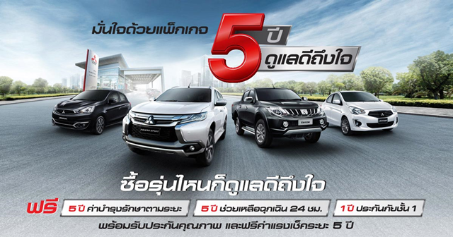 ข้อเสนอพิเศษสำหรับผู้ที่สนใจสั่งจองรถยนต์มิตซูบิชิทุกรุ่นและรับรถยนต์ภายในวันที่ 31 ธันวาคม 2560 รับฟรี "โปรแกรม 5 ปี ดูแลดีถึงใจ" ประกอบด้วย ฟรีค่าบำรุงรักษาตามระยะนาน 5 ปี, ฟรีบริการช่วยเหลือตลอด 24 ชั่วโมง นาน 5 ปี, ฟรีการรับประกันคุณภาพ Diamond Warranty นาน 5 ปี , ฟรีค่าแรงการเช็คระยะนาน 5 ปี และ ประกันภัยชั้น 1 ฟรี 1 ปี