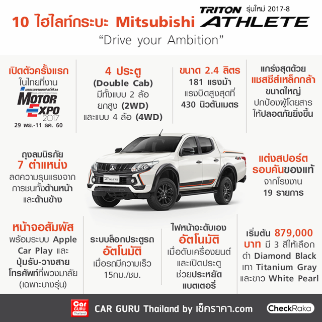 รถกระบะยังคงเป็นหนึ่งในรถที่ได้รับความนิยมในตลาดรถยนต์ไทยมาตลอด ล่าสุดกับการเปิดตัว Mitsubishi Triton Athlete กระบะสายพันธุ์สปอร์ตน้องใหม่ของมิตซูบิชิ ที่โดดเด่นด้วยอุปกรณ์ตกแต่งพิเศษรอบคันจากโรงงานมากถึง 19 รายการ อาทิ กระจังหน้าและกันชนหน้าดีไซน์ใหม่, สปอร์ตบาร์, สปอยเลอร์หลัง, ล้ออัลลอยขนาด 17 นิ้ว, สติกเกอร์ลายกราฟิกตกแต่งรอบคันสีดำ-ส้ม