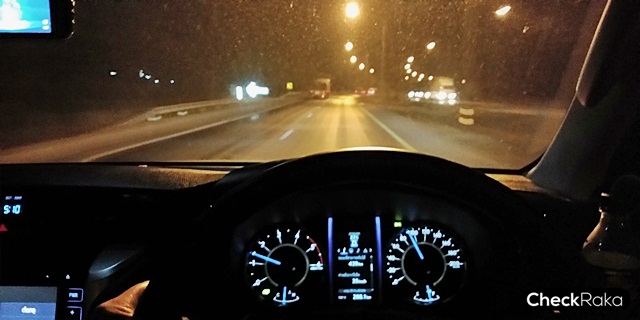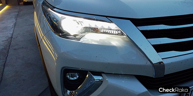 ยามค่ำคืนนั้นระบบไฟหน้า LED ของฟอร์จูนเนอร์สว่างสมคำร่ำลือ (แยงตา) แต่สำหรับคันที่ทดสอบนั้นได้มีการปรับปรุงแก้ไขระดับไฟหน้ามาแล้ว โดยดูจากการที่จอดติดท้ายรถเก๋ง ลำแสงไฟหน้าจะไปถึงกระจกมองข้างหรือกระจกมองหลังรถคันด้านหน้า (หากไม่จอดชิดมากๆ) หรือดูจากระยะลำแสงที่ส่องผิวถนนเมื่อรถโล่งๆ จะกดต่ำลงพื้นมากขึ้นกว่าเดิมพอสมควรครับ เพราะเมื่อขับผ่านเส้นทางมืดมากๆ จำเป็นต้องคอยเปิดไฟสูงดูทางเป็นระยะๆ