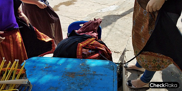 ก่อนสักการะหากเป็นสุภาพสตรีจำเป็นต้องยืมผ้าถุงนุ่งก่อนเข้าบริเวณพระธาตุ และให้บริการ "ฟรี"