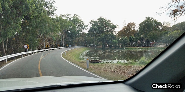 เมื่อขับไปอีกราวๆ 2-3 ชม. เข้าสู่จังหวัดกาฬสินธุ์ก็เริ่มใกล้ถึงจุดที่คิดว่าน่าจะลำบากในการขับขี่ขึ้นเขาในช่วงภูพาน โดยก่อนไปนั้นได้อ่านรีวิวเส้นทาง หลายคนก็บอกว่าทางขึ้นเขาจะลำบาก อันตรายและต้องระมัดระวังอย่างดี แต่เมื่อถึงช่วงเทือกเขาภูพาน และผ่านเส้นทางคดเคี้ยวไปมาและทางชันต่างๆ แล้ว สำหรับฟอร์จูนเนอร์นั้น สบายๆ เลยครับ ควบคุมก็ง่าย อัตราเร่งก็ดี ระยะเบรกหรือน้ำหนักในการใช้เบรกก็นุ่มสบายเท้า ออกแรงไม่มากนักก็สามารถชะลอหรือหยุดรถในยามคับขันได้อย่างมั่นใจ อาจมีในบางจังหวะที่ต้องหักเลี้ยวโค้งมากๆ ตัวรถมีอาการโคลงบ้าง ซึ่งต้องลดความเร็วลงอีกเพื่อให้ขับผ่านไปได้อย่างนุ่มนวลและปลอดภัย เพราะแม้ว่าระบบช่วงล่างและเบรกจะดีแค่ไหน แต่รถที่รูปทรงสูงๆ และล้อโตใส่ยาง All-terrain ย่อมมีขีดจำกัดครับ ผลคือ ถ้าเข้าโค้งแรงเกินไป หน้าดื้อเล็กน้อย ต้องลองใส่ระบบ 4H เพิ่มเข้าไป จึงควบคุมได้ดีมากขึ้นและไม่มีเสียงร้องของยางมากนัก