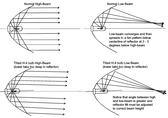 การเปลี่ยนหลอดไฟที่ไม่ตรงกับของเดิมๆ จากโรงงานหรือมาตรฐาน หลอดเหล่านี้จะไม่สามารถติดตั้งในตำแหน่งเดิมได้ 100 เปอร์เซ็นต์ มักจะคลาดเคลื่อนออกไปจากจุดที่รวบรวมและสะท้อนแสงออกไปสู่ด้านนอก ทำให้ลำแสงฟุ้งกระจายไม่มีทิษทางชัดเจน แต่เมื่อมองสวนกลับมาจะรู้สึกว่ามีความ "จ้า" และ "แสบตา" มากขึ้น และเมื่อใช้งานจริงยิ่งเห็นได้ชัดว่าความสว่างของลำแสงไม่ได้เป็นเส้นตรงหรือ "คัทออฟ" เหมือนเช่นไฟเดิมๆ จากโรงงาน แสงจะกระจายไปโดยรวบๆ มากกว่าส่องที่ถนน ซึ่งโคมไฟเดิมๆ ไม่ได้ถูกออกแบบมาให้ใช้กับหลอดดัดแปลงเหล่านี้
