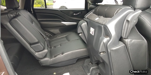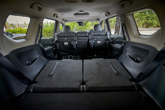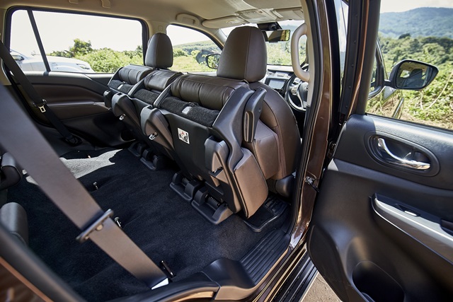 เบาะคู่หน้าขนาดใหญ่ เบาะตอนที่สองมีระบบพับเบาะอัตโนมัติ one touch ด้วยสวิตช์ไฟฟ้าบริเวณคอนโซลกลางเพียงกดเบาะก็เด้งพับอัตโนมัติ สะดวกไปต้องสบายโดยที่คนขับหรือผู้โดยสารไม่ต้องพับเองด้วยมือ เบาะตอนที่สาม 2 ตำแหน่งพับแบนราบได้ และออกแบบให้ที่นั่งแบบแบบโรงหนังคือ ไล่ระดับสูงขึ้นไป เพื่อการมองเห็นทุกมุมมองไม่ว่าจะนั่งเบาะไหน ส่วนโทนสีภายในหากเป็นรุ่น 2WD เบาะจะเป็นสีดำและรุ่น 4WD เบาะสีน้ำตาล