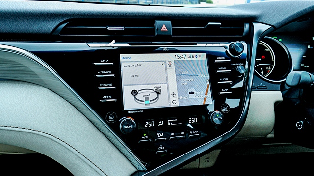 มาตรวัดเรืองแสง Optitron พร้อมจอแสดงผลข้อมูลการขับขี่ TFT ขนาด 7 ส่วนเครื่องเสียงจอสัมผัส 7 นิ้ว ในรุ่น 2.5 G และ 8 นิ้วในรุ่น 2.5 HV เทคโนโลยีล้ำหน้า T-Connect Telematics เชื่อคุณและรถเป็นหนึ่งเดียว หน้าจอแสดงผลข้อมูลการขับขี่แบบสีบนกระจกหน้ารถ เครื่องเล่น DVD แบบหน้าจอสัมผัสขนาด 8 นิ้ว ลำโพง JBL 9 ตำแหน่ง ออกแบบระบบเสียงให้เหมาะสมกับคัมรี่ใหม่โดยเฉพาะจากทีมงานช่างเทคนิคของ JBL Audio
