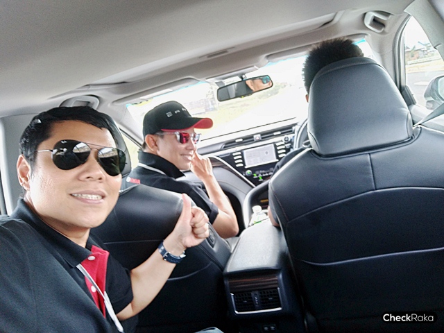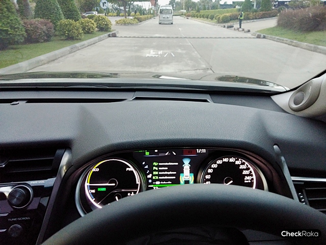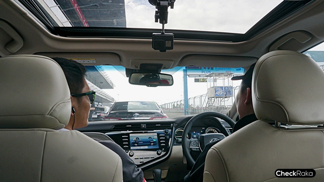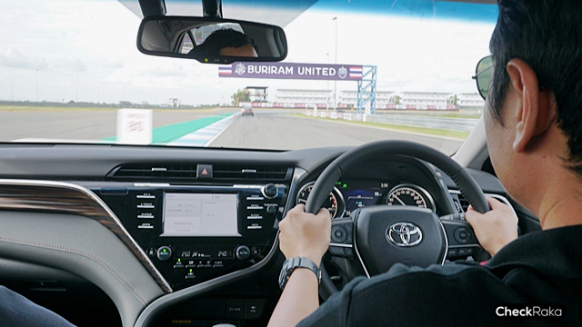 เริ่มการทดสอบ All-new Toyota Camry 2019 ใหม่ ด้วยเซกชั่นแรกขับบนถนนจริงใน จ.บุรีรัมย์ แบบเน้นตัวเลข "ประหยัด" ระยะทาง 54 กม. ภายใน 1 ชม. สื่อมวลชลนั่ง 3 คน/คัน สัมผัสถึงความนุ่มนวล แต่คงแน่นหนึบ จากการได้ลองขับรุ่น 2.5 HV Hybrid ในขาไปนั้นแอดช้างขับแบบไม่ได้เน้นตัวเลขแบบชนะเลิศมากนัก โดยยังเปิดแอร์ที่อุณหภูมิปกติ 24 องศา เปิดกระจกและซันรูฟ เล่นกล้องทีมงานโตโยต้า ใช้ความเร็วประมาณ 60 - 90 กม./ชม. อัตราสิ้นเปลืองบนมาตรวัดที่ 23.1 กม./ลิตร