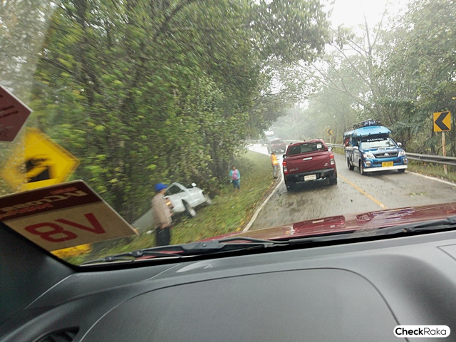 ระหว่างทางก็มีรถชาวบ้านลงไหล่ทางซึ่งกั้นด้วยต้นไม้ก่อนเป็นไหล่เขา แต่โชคดีที่ปลอดภัย