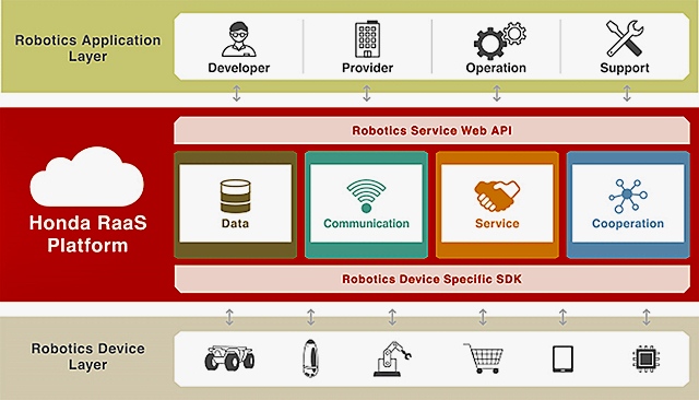ซึ่งตอนนี้ ฮอนด้ากำลังมองหาพันธมิตรที่จะมาร่วมทดสอบการใช้งาน P.A.T.H. Bot ร่วมกัน เพื่อให้การพัฒนาโรโบติกส์เป็นไปได้ง่ายขึ้น ฮอนด้าได้เปิดตัว Honda RaaS (Robotics as a Service) Platform ซึ่งเป็นแนวคิดแพลตฟอร์มซอฟต์แวร์สำหรับฟังก์ชั่นการทำงานทั่วไป เช่น การเก็บและแชร์ข้อมูล การควบคุมการสื่อสาร การเปลี่ยนแปลงสถานะ และการร่วมมือกันระหว่างหุ่นยนต์ ผ่านอินเทอร์เฟซหรือแพ็คเกจ API*2 และ SDK*3 โดยฮอนด้ามีเป้าหมายที่จะผลักดันให้เกิดการบูรณาการของบริการโรโบติกส์ ผ่านการทำงานร่วมกันระหว่างอุปกรณ์หุ่นยนต์ ระบบ และแอปพลิเคชันต่างๆ ซึ่งพัฒนาโดยฮอนด้าและพันธมิตร