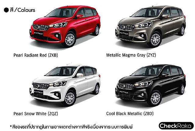 All New Suzuki ERTIGA ให้เลือกทั้งหมด 4 สี ได้แก่ Radian Red, Magma Grey, Pearl White Snow และ Prime Cool Black โดยมี 2 รุ่น คือ