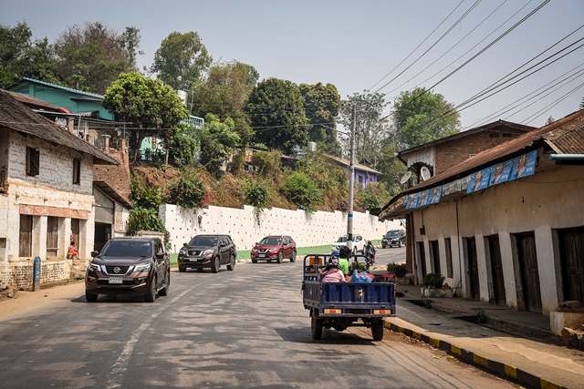 หลังจากขึ้นฝั่งก็กลับมาขบวนเพื่อเดินทางต่อให้ทันพลบค่ำ ที่เมืองน้ำจ๋าง ในรัฐฉาน ที่นี่ยังมีกลิ่นอายของการทำสงคราม อยู่เป็นเนืองๆ การเดินทางวันนี้เราเปลี่ยนพาหนะมาเป็น นิสสัน นาวาร่า แบล๊ค อิดิชั่น ใหม่ เครื่องยนต์ดีเซล 2.5 ลิตร คอมมอนเรล 4 สูบ 163 แรงม้า 7 สปีด (เกียร์ธรรมดา 6 สปีด) วันนี้เราประจำเป็นผู้โดยสารทั้งหน้า และหลัง