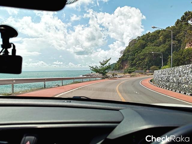 หลังจับขับตากแอร์ที่เย็นเจี๊ยบของซีวิคได้ไม่นาน ผู้เขียนก็มาจอดที่ลานหินขาวเพื่อซึมซับบรรยากาศชายหาด ท้องทะเลของหาดแม่รำพึง ที่วันนั้นก็ยังดูเงียบเหงา ถนนเลียบชายหาดโล่งตา การขับซีวิคใหม่เรียบไปตามถนนชายหาด ดีที่มุมมองจากภายในห้องโดยสารกว้าง ดูโปร่งตาจริงๆ