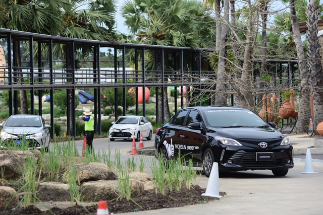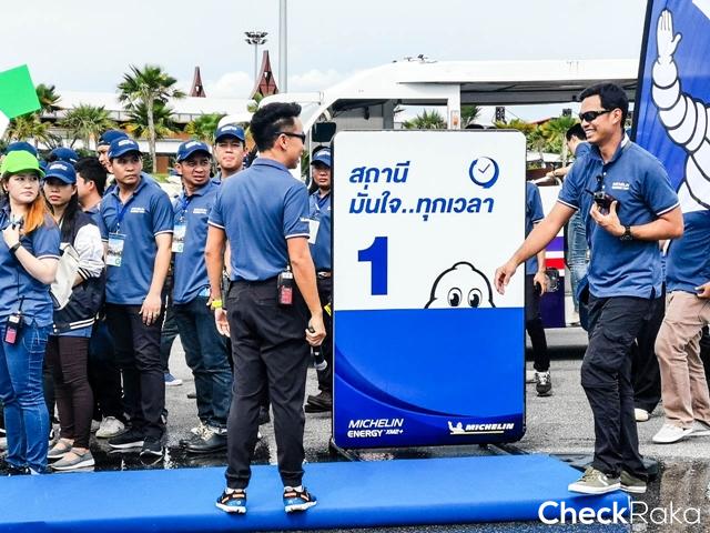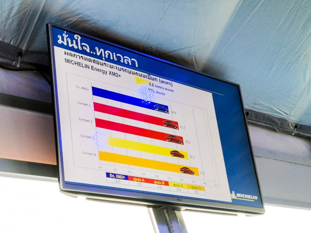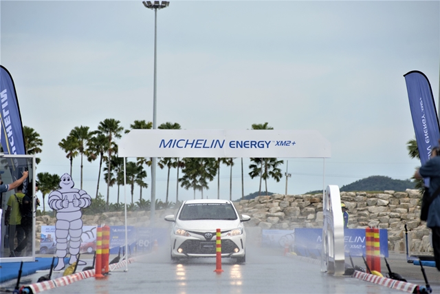 การทดสอบจะมีทั้งหมด 3 สถานี สถานีแรกที่เราทำการทดสอบโดยให้อินสตักเตอร์ได้ทดสอบขับด้วยยางเดิมติดรถของคู่แข่ง 3 ยี่ห้อ และนำมาเทียบกับ มิช ลิน เอนเนอจีย์ เอ็กซ์เอ็ม 2+ กับการวิ่งบนพื้นถนนจำลองความลื่นและการยึดเกาะถนน