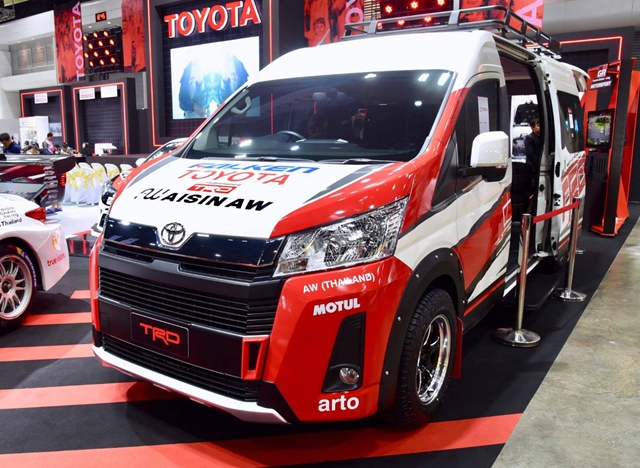 ขณะที่อีกสไตล์ COMMUTER RALLY SUPPORT VEHICLE CONCEPT by TRD รถต้นแบบของการแต่งรถเพื่อซัพพอร์ตทีมแรลลี่ จากแรงบันดาลใจ บนแทร็กจริง ในการแข่งขันรายการ Asia Cross Country มาสู่แรงบันดาลใจในดีไซน์ ด้วยพื้นฐานของโครงสร้างที่ออกแบบใหม่ มาพร้อมอุปกรณ์ภายนอกที่ครบครัน TRD นำรถยนต์โตโยต้า คอมมูเตอร์รุ่นล่าสุดที่เพิ่งเปิดตัวไปในเดือนที่แล้ว ด้วยจุดเด่นของตัวถังขนาดใหญ่ พื้นที่ห้องโดยสารกว้างขวาง ผสานกับนวัตกรรมใหม่การพัฒนา เมื่อมารวมกับการออกแบบของ TRD ที่ได้พัฒนา คอนเซ็ปต์คาร์คันนี้ ให้มีพื้นที่เอนกประสงค์ (Multi-use Floor) สามารถปรับเปลี่ยนได้อย่างอิสระ บรรจุที่นั่ง โต๊ะ เก้าอี้ อุปกรณ์กล่องเครื่องมือ ยางอะไหล่ อุปกรณ์ต่างๆได้อย่างครบครัน สำหรับทีมแมคคานิค ที่จะพร้อมเข้าช่วยเหลือทีมรถแข่งได้ทันที ด้วยการออกแบบพื้นที่กว้างขวาง ยังสามารถปรับเพื่อใช้งานได้หลากหลาย หรือ จะติดตั้งลิฟท์ เพื่อบรรทุกรถWelcab หรือ เบาะวีลแชร์ผู้สูงอายุ และผู้พิการ ก็สามารถทำได้