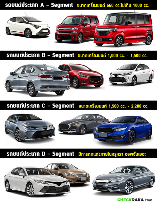 เป็นรถยนต์ที่มีขนาดใหญ่กว่า รถยนต์ประเภท A - Segment เครื่องยนต์ขนาด 1,000 cc. - 1,500 cc. - รถยนต์ประเภท C - Segment