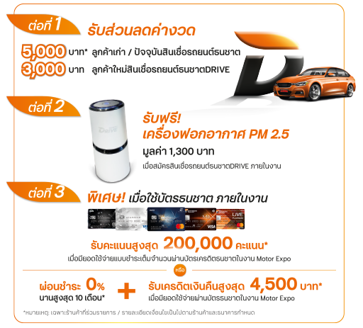 ต่อที่ 2 รับฟรี! เครื่องฟอกอากาศ PM 2.5 มูลค่า 1,300 บาท (เมื่อสมัครสินเชื่อธนชาตDRIVE ภายในงาน Motor Expo 2019)