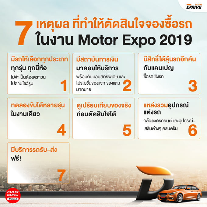 5) ดูเปรียบเทียบก่อนตัดสินใจ >> ก่อนการตัดสินใจโดยเฉพาะการซื้อรถเราควรได้เปรียบเทียบก่อน เมื่อมาในงาน Motor Expo 2019 เราสามารถเดินดูและเปรียบเทียบรถที่เราสนใจได้ทั้งงาน แบบครบจบ...ในงานเดียว ไม่ว่าจะเป็นเรื่องรูปลักษณ์ภายใน-นอก สมรรถนะเครื่องยนต์ จุดเด่น-ด้อย ราคา และความเหมาะสมในการใช้งาน เป็นต้น