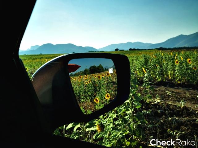 หลังจากขับรถผจญภัยกันพอสนุกตื่นเต้นก็ได้เวลาไปหาธรรมชาติที่สวยงามกันต่อ เราเดินทางขับไปชมทุ่งทานตะวันที่บ้านห้วยขมิ้นไม่ไกลจากวัดมากนัก เจ้าของพื้นที่ให้นำรถขับเข้าไปชมได้ คิดเพียงคันละ 50 บาท ไม่คิดผู้เข้าติดรถ ที่ด้านหน้าทางเข้ามีผลไม้และขนมจากชาวบ้านมาขายในราคาไม่แพง เรามีเสบียงติดมาอยู่แล้วการขับเข้าไปชมทุ่งทานตะวันพร้อมเปิดท้ายรถจิบเครื่องดื่มและขนมไปด้วย มันเป็นช่วงที่เวลาที่เพลิดเพลินและไม่เคยทำมาก่อน เพราะปกติมาด้วยรถยนต์
