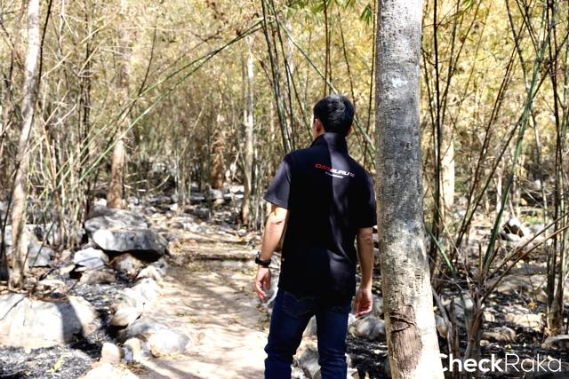 เมื่อมาถึงวัดเวฬุวัน ภายในวัดเต็มไปด้วยนกยูงสีสันสวยงาม ที่ถูกปล่อยให้เดินอยู่กันอย่างอิสระ บนวัดที่เป็นเขานั้นก็มีฝูงลิงคอยมาด้อมมองหาอาหารจากผู้มาเยือนอย่างเรา ทำให้ต้องพยายามเก็บของใช้ไว้ในรถเพื่อความปลอดภัย ภายในวัดมีทางแยกเข้าสู่ป่ามีร่องรอยเส้นทางรถไว้ให้ติดตาม พื้นเป็นทางดินผสมหินน้อยใหญ่ ต้นไม้รอบด้านโปร่งไม่ทึบมากทำให้มีแสงสว่างชัดเจนตลอด ผู้เขียนตัดสินใจขับ อีซูซุดีแมคซ์ วี-ครอส 4x4 รุ่น 4 ประตู Ddi ZP เข้าไปค้นหาปลายทาง ถ้าเป็นรถยนต์ส่วนตัวเองก็คงจอดและเดินท่องเที่ยวกันอยู่ภายในวัด การที่ได้ขับรถกระบะอย่าง วีครอส ทำให้รู้สึกถึงความเป็นอิสระในการเดินทางมากขึ้น ไม่ต้องกังวลเรื่องของเส้นทางและอุปสรรคมากนัก ผู้เขียนขับตามเส้นทางธรรมชาติเข้าไปเรื่อยๆ รอบด้านนั้นดูเปลี่ยวและวังเวง แต่พื้นผิวก็ไม่ได้ยากจนต้องใช้ระบบขับเคลื่อน 4 ล้อ เสมือนเรามียังมีพระเอกที่เป็น 4X4 ให้ใช้งานเมื่อจำเป็นอยู่ เส้นทางบางช่วงอาจแย่เป็นพื้นทราย หลุม หรือร่องที่ทรุดไม่เท่ากัน แต่ด้วยแรงบิดที่มากมายจากเครื่องยนต์ 3.0 ดีดีไอ บลูเพาเวอร์ ก็สามารถเดินคันเร่งเนียนๆ ผ่านได้สบาย