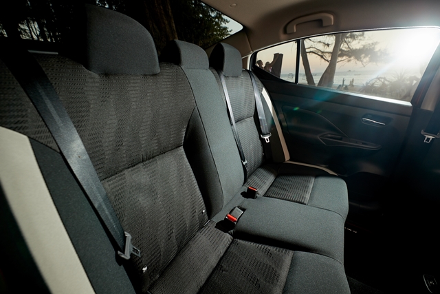ในส่วนตำแหน่งเบาะหลังนั้น ให้ความนุ่มสบายตัวแต่คงรูปทรงที่กระชับเช่นเดียวกัน ทำให้เมื่อนั่งแล้วลำตัวไม่ขยับมากเกินไป และตัวเบาะก็ไม่นุ่มจนจมเกินไป พื้นที่วางขากว้างขวาง จากการทดลองนั่ง "ลืม" ปรับเลื่อนเบาะไปข้างหน้าเพราะใช้นั่งมาก่อนหน้านี้ จึงทำให้เหลือช่วงหัวเข่าไม่มากนัก ซึ่งตัวเบาะด้านหน้านั้นปรับถอยหลังมาอีกเพียง 3 ล็อคก็สุด และหากนั่งจริงๆ ก็ต้องเลื่อนไปด้านหน้ามากกว่านี้