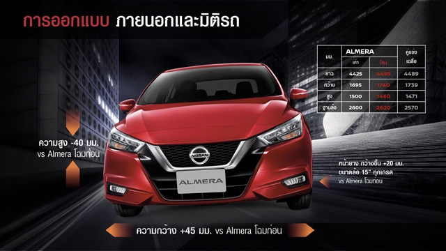 นิสสัน อัลเมร่า ใหม่ (All-new Nissan Almera) รถยนต์ "อีโคคาร์" เฟส 2 หลังเปิดตัวเมื่อปลายปีที่ผ่านมา (2019) อัลเมร่าใหม่สร้างเซอร์ไพรส์ด้วยรูปทรงใหม่ทั้งคัน กระจังหน้าแบบ V-Motion ไฟหน้าและไฟท้ายทรงบูมเมอแรง แนวเสาหลังคาหลังที่ถูกยกขึ้น (kick-up C-pillars) และ หลังคาแบบลอยตัว (floating roof)