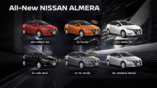 All-new Nissan Almera มาพร้อม 6 สี ได้แก่ สีแดง เรเดียนท์ เรด (Radiant Red) สีส้ม โมนาร์ช (Monarch Orange) สีขาว สตอร์ม ไวท์ (Storm White) สีดำ แบล็ค สตาร์ (Black Star) สีเทา กัน เมทาลิค (Gun Metallic) และสีเงิน บริลเลียนท์ ซิลเวอร์ (Brilliant Silver)