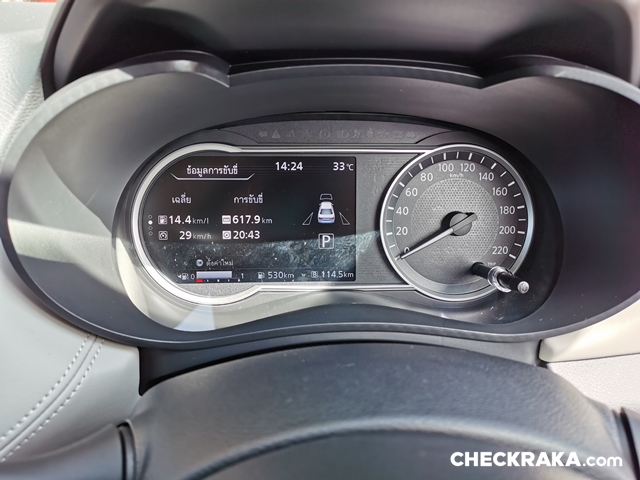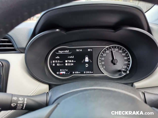 มาตรวัดให้ความล้ำหน้าด้วยจอแสดงข้อมูลการทำงานของรถผ่านจอ TFT ขนาด 7 นิ้ว (คล้ายกับในนิสสัน ลีฟ อีกแล้ว) แสดงข้อมูลต่างๆ เช่น ระยะทาง อัตราสิ้นเปลืองเฉลี่ย อุณหภูมิ ความเร็วเฉลี่ย และแจ้งเตือนมุมอับผ่านกราฟิกรูปรถอย่างชัดเจน คอนโซนหน้าด้านบนยังเป็นวัสดุผิวแข็งแต่ถัดลงมาเป็นวัสดุนุ่มมือ เล่นสีทูโทนดำ-ครีม นอกจากนี้ติดตั้ง Push Start ในตำแหน่งฐานเกียร์เพื่อใช้งานสะดวกขึ้น โดยรวมทำออกมาได้ดีลงตัวและสะดวกในการใช้งานจริงๆ