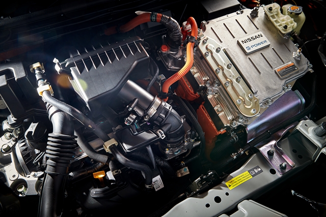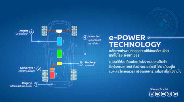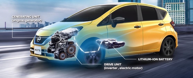 อี-เพาเวอร์ เทคโนโลยี ประกอบด้วยเครื่องยนต์สันดาปภายในที่ใช้น้ำมันเชื้อเพลิง, เครื่องกำเนิดไฟฟ้า (Generator), แบตเตอรี่ (Battery), อุปกรณ์แปลงกระแสไฟฟ้า (Inverter), และ มอเตอร์ไฟฟ้า (Motor) โดยรถยนต์จะถูกขับเคลื่อนด้วยกำลังจากมอเตอร์ไฟฟ้าเท่านั้น ซึ่งกระแสไฟฟ้าที่ถูกส่งมาให้กับมอเตอร์ไฟฟ้านั้น จะถูกเก็บอยู่ในแบตเตอรี่กำลังสูง โดยที่มีเครื่องยนต์สันดาปภายในทำหน้าที่ในการสร้างกระแสไฟฟ้าเข้ามาเก็บอยู่ตลอดเวลาเพื่อชดเชยกระแสไฟฟ้าที่ถูกใช้งานไป ขุมพลังแบบ อี-เพาเวอร์ (e-POWER) ให้แรงบิดในทันทีรวมถึงอัตราเร่งที่รวดเร็ว และแรงบิดที่นุ่มนวล แหงล่ะก็รถยนต์ไฟฟ้าไง..