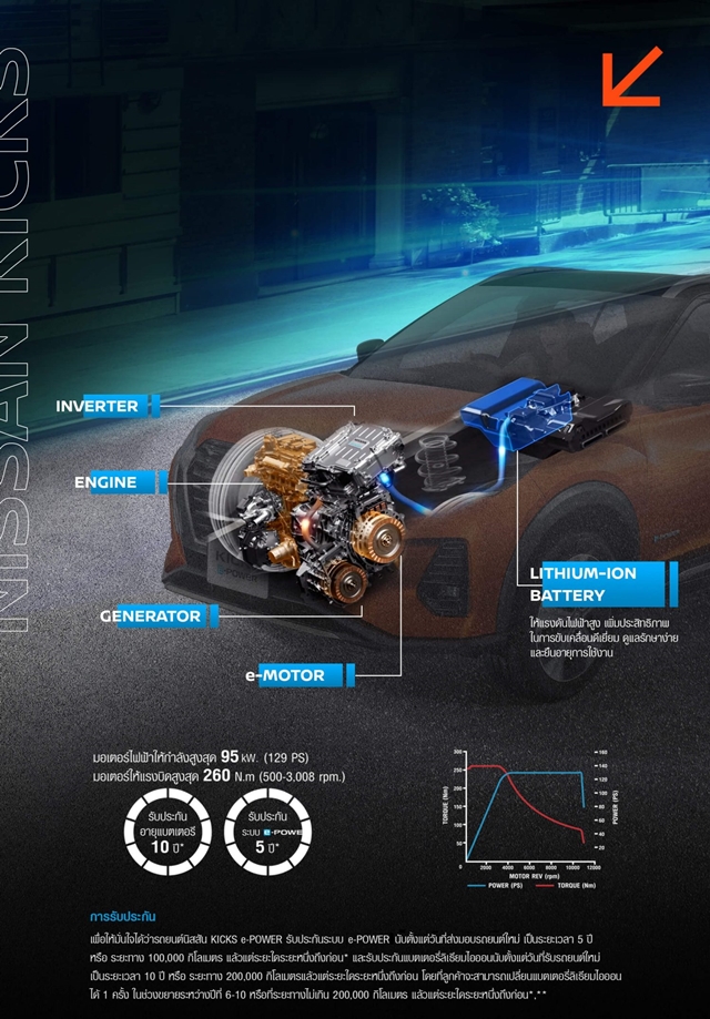 ดังนั้น Nissan Kicks e-Power คือ....รถยนต์ไฟฟ้าครับ แต่ว่าในนิสสัน คิกส์ มีดีมากกว่านั้น!! เพราะมีการติดตั้งเครื่องยนต์ 1.2 ลิตร ทำหน้าที่เหมือนโรงผลิตไฟฟ้าเล็ก ๆ หรือแหล่งต้นกำเนิดการผลิตไฟฟ้าเข้าไปใต้ฝากระโปรง และอยู่ร่วมกันกับระบบ เครื่องกำเนิดไฟฟ้า (Generator), อุปกรณ์แปลงกระแสไฟฟ้า (Inverter) และมอเตอร์ไฟฟ้า (Motor) อย่างมีความสุข นั่นคือ ขับไปชาร์จไฟเข้าแบตเตอรี่ไปตลอดเวลา ไม่ต้องแวะหาสถานีชาร์จที่ยังไม่แพร่หลายนักในประเทศไทย เพียงแค่ขับไปเรื่อย ๆ จนระดับน้ำมันในถังขนาด 41 ลิตรลดลงก็แค่แวะปั้มเติมน้ำมัน ซึ่งรองรับเบนซินแก๊สโซออลถึง E20 เข้าไป ใช้ชีวิตทุกอย่างเหมือนเดิมเพิ่มเติมคือ ความประหยัด!