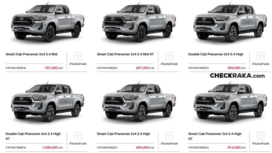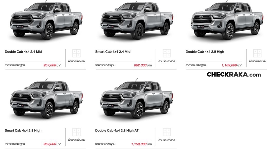 New Toyota Hilux Revo รุ่น ขับเคลื่อน 4 ล้อ 4WD มี 5 รุ่น ราคา 862,000 - 1,159,000 บาท และ Pre-Runner มี 12 รุ่น ราคา 707,000 - 1,009,000 บาท