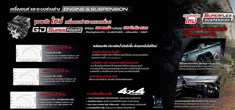 นอกจากนี้ในเครื่องยนต์ 2.8 ลิตร ขับเคลื่อน 4 ล้อ มีการปรับลดความเร็วรอบเดินเบา (จาก 850 รอบต่อนาที เป็น 680 รอบต่อนาที) สามารถลุยเส้นทาง Off-Road ได้เนียนมากขึ้น