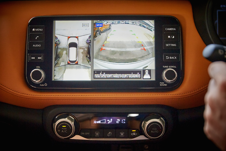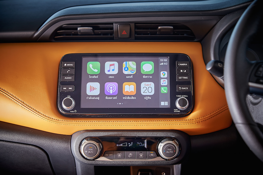 ในเรื่องของสีทูโทนด้านในหากใครอยากได้ อาจต้องเพิ่มสตางค์สักหน่อย ระบบความบันเทิงขนาดพอดีหน้าจอ 8 นิ้ว เป็นจอทัชสกรีน แต่มีปุ่มเมนู และอื่นๆ ด้านข้าง พร้อมรองรับระบบ ความบันเทิง ต่างๆ สำหรับรุ่น V และ VL สามารถใช้การเชื่อมต่อ Nissan Connect อินโฟเทนเมนต์ (infotainment) มาพร้อมระบบเครื่องเสียง Display Audioลำโพงคุณภาพสูง 6 ตำแหน่งพร้อมการเชื่อมต่อ AM / FM / Bluetooth / USB / AUX-in รองรับการเชื่อมต่อโทรศัพท์แบบสมาร์ทโฟนผ่าน Apple CarPlay (สำหรับระบบ iOS) การเชื่อมต่อโทรศัพท์ไร้สายแบบบลูทูธบนพวงมาลัยเพื่อการควบคุมที่สะดวกยิ่งขึ้น นอกจากนี้ยังมีหน้าจอ TFT Digital Meter ขนาด 7 นิ้ว บนหน้าปัด ที่สามารถแสดงข้อมูลการขับขี่รวมถึงการใช้น้ำมันเชื้อเพลิง แสดงมาตรวัดอุณหภูมิภายนอกมาตรวัดความเร็ว ระบบการขับขี่และการควบคุมและระบบข้อมูลและความบันเทิงขณะขับขี่