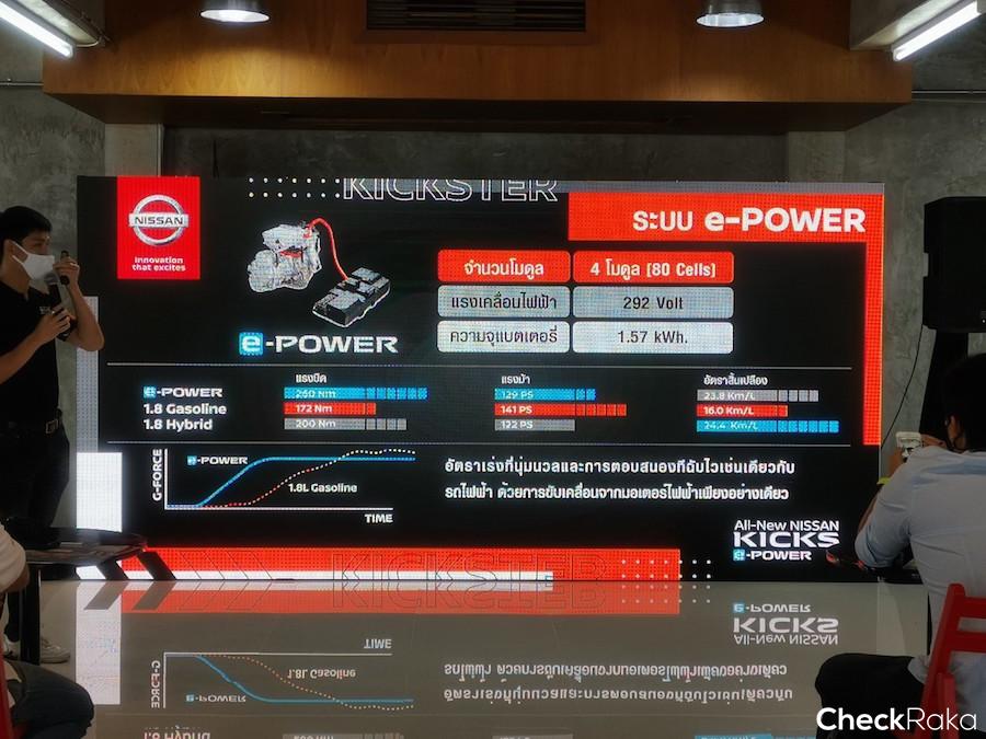 นิสสัน คิกส์ อี-พาวเวอร์ ใหม่ ที่มีการใช้เครื่องยนต์ HR12DE ขนาด 1.2 ลิตร แถวเรียงแบบ DOHC (Double Overhead Camshaft) 12 วาล์ว 3 สูบ รับหน้าที่เป็นเครื่องกำเนิดไฟฟ้า และยังมีส่วนประกอบของระบบขับเคลื่อนด้วยไฟฟ้าที่สำคัญ ๆ อาทิ เครื่องแปลงกระแสไฟฟ้า (Inverter) มอเตอร์ไฟฟ้าแบบ EM57 ให้กำลังสูงสุด 129 แรงม้า (PS) มีแรงบิดสูงสุด 260 นิวตันเมตร (Nm) และแบตเตอรี่ลิเธียมไอออนขนาด 1.57 กิโลวัตต์-ชั่วโมง (kWh) มีจำนวน 4 โมดูล เทคโนโลยีนี้มอบการเร่งความเร็วที่ราบรื่น การขับขี่ที่เงียบ และการประหยัดน้ำมันที่มีประสิทธิภาพสูงลดความกังวลใจในเรื่องของการชาร์จพลังงานไฟฟ้า ที่บ้านเราอาจจะยังไม่ครอบคลุม
