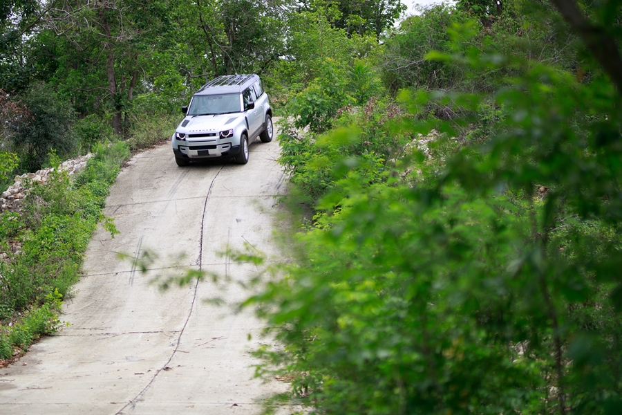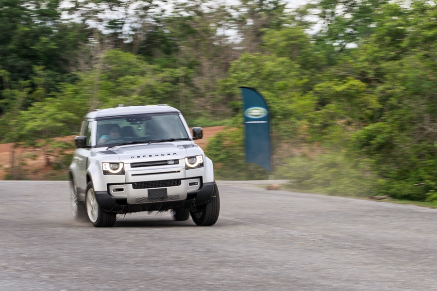 ผ่านไปกับความลุยมาถึงจุดทดสอบอัตราเร่งของขุมพลังในช่วงสั้น ๆ ซึ่งเป็นไปตามคาดนั่นคือ ให้อัตราเร่งจัดจ้านไต่ระดับถึง 80 กิโลเมตรต่อชั่วโมงอย่างรวดเร็ว และทดลองเบรกเพื่อดูระบบควบคุมการทรงตัวที่จะช่วยรักษาอาการเป๋ไปมาได้เป็นอย่างดี ต่อด้วยการขับแบบสลาลอมเพื่อดูระดับความเอียงของตัวรถเมื่อถูกหักเลี้ยวอย่างรวดเร็ว ซึ่งใน Defender ใหม่ มีระบบช่วงล่างที่ดีขึ้นช่วยลดอาการเอียงของตัวถังได้มาก โดยดูได้จากหน้าจอที่สามารถแสดงมุมเอียงของรถที่ขยับเพียง 2 - 3 องศาเท่านั้น