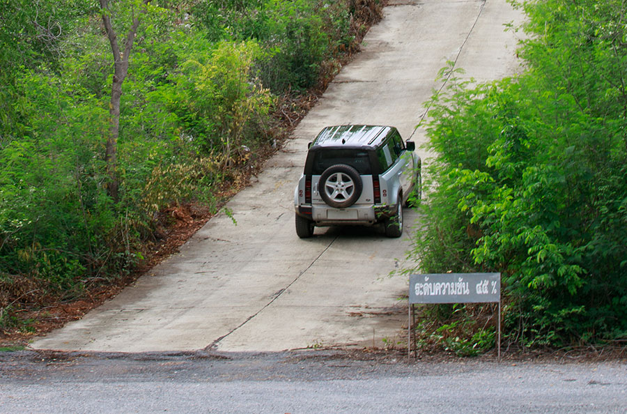 จุดทดสอบขึ้นทางลาดชันระดับ 45 องศา เพื่อทดสอบกำลังของเครื่องยนต์ดีเซลเทอร์โบ 240 แรงม้า 430 นิวตันเมตร ด้วยความชันระดับนี้สามารถไต่ระดับขึ้นไปได้ง่ายมาก โดยแทบไม่ต้องเติมคันเร่งมากนักและไม่ต้องใช้เกียร์ LOW หรือเกียร์ต่ำแต่อย่างใด