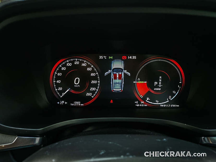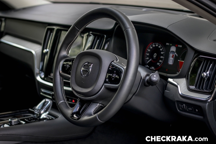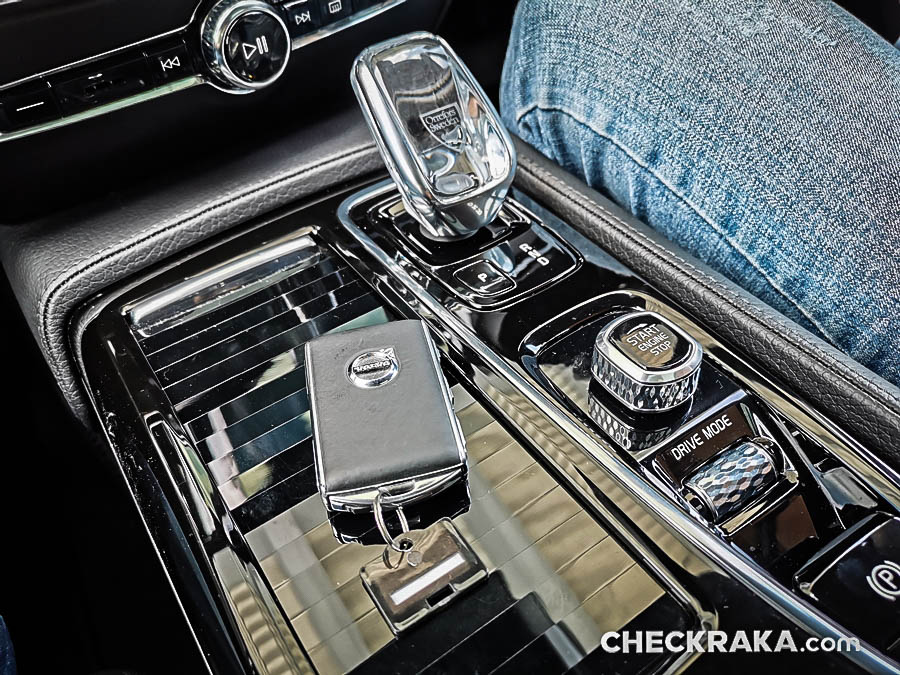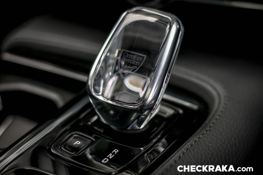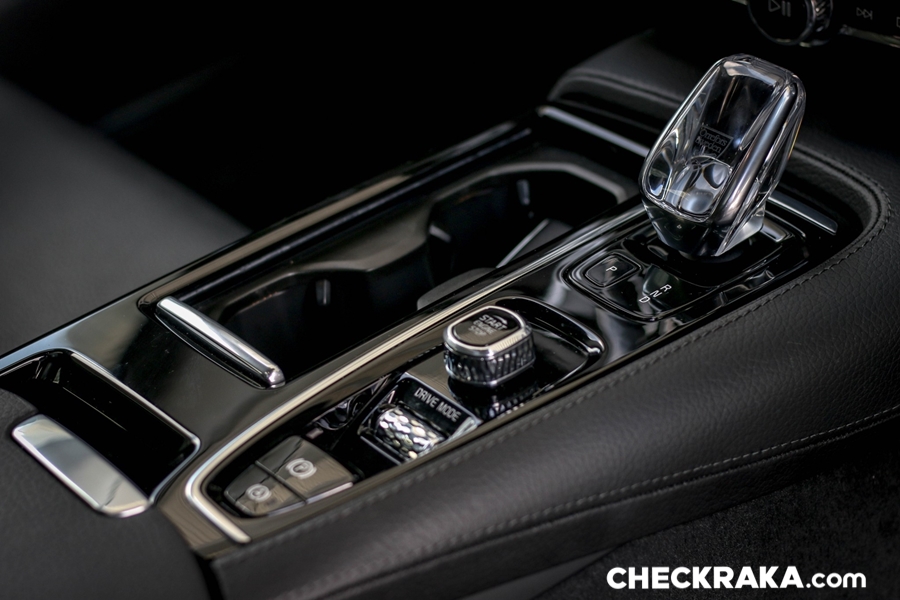 คอนโซลกลางขนาดใหญ่ไปสักหน่อยซึ่งข้างใต้ติดตั้งระบบชุดไฮบริดเอาไว้บางส่วนจึงกินที่ตรงส่วนนี้ไปพอสมควร หัวเกียร์แบบแท่งคริสตัลใสมีรูป "แมวน้ำ" จาก Orrefors Sweden ซึ่งเป็นบริษัททำเครื่องแก้วชื่อดังก่อตั้งเมื่อ 1898 ของประเทศสวีเดน ถัดลงมาเป็นสวิตช์ Start-Stop เครื่องยนต์ที่ "เซอร์ไพร์ส" โดยใช้การหมุนไปทางขวานับเป็นเอกลักษณ์เฉพาะของวอลโว่จริงๆ ถัดมาเรื่องย ๆ จะมีสวิตช์ระบบเบรกมือไฟฟ้าและ Auto Hold Brake และข้างกันเป็นช่องวางแก้วน้ำพร้อมฝาปิดเรียบร้อยสวยงาม