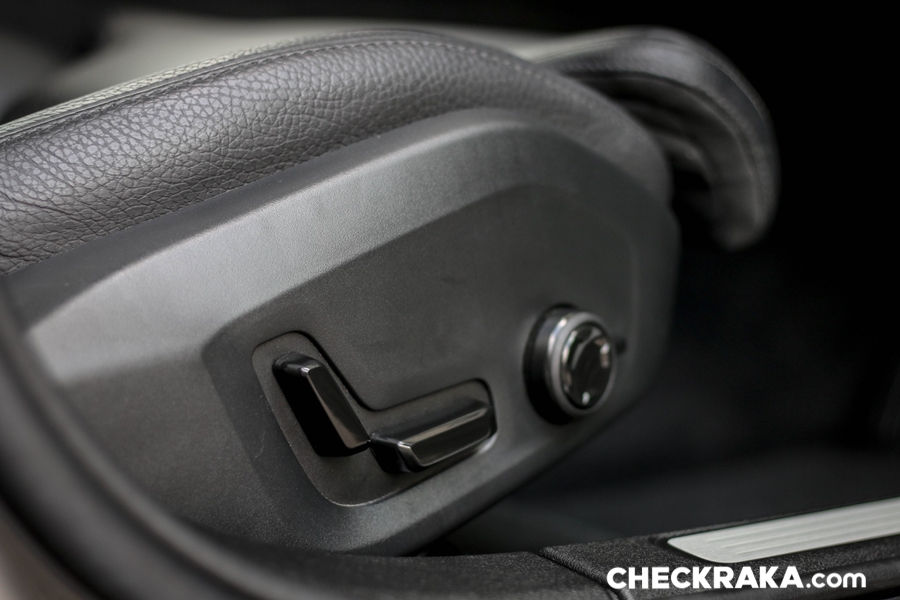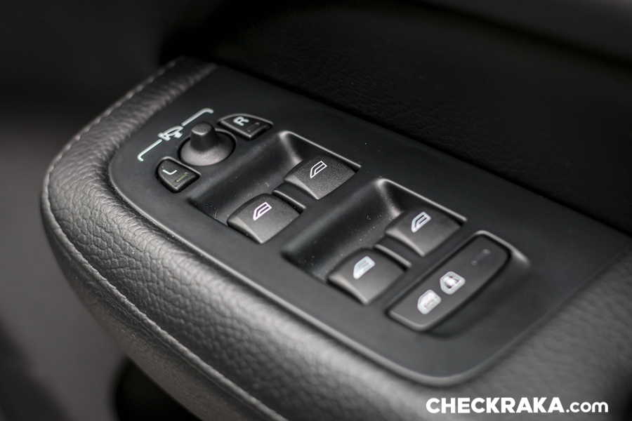 เบาะคู่หน้าปรับไฟฟ้าแบบเมโมรี่ 2 ตำแหน่ง พร้อมมีระบบดันหลังและปรับแผ่นรองน่องเข้า-ออกได้อีกด้วย ปุ่มสวิตช์กระจกแผงประตูข้างฝั่งคนขับนุ่มนิ้วกดง่ายเป็นแบบอัตโนมัติขึ้น-ลงทั้ง 4 บาน และอีกหนึ่งความแหวกแนวคือ สวิตช์ปรับกระจกมองข้างเมื่อต้องการพับเก็บกระจกต้องกด 2 ปุ่ม (R/L) พร้อมกัน!