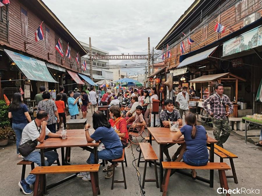 เรามารอตลาดเปิดตั้งแต่ 16.00 น. แต่ฝนก็เทกระหน่ำลงมาไล่ จนต้องไปนั่งชมวิว กินโรตีมาเลฯ จิ้มนมข้นหวานรอที่ร้านมุมสะแกคาเฟ่ที่ตั้งอยู่ริมแม่น้ำสะแกกรัง ติดสะพานวัดโบสถ์ จนฝนซาจึงพากันไปเดินท่องตลาดกัน ถนนคนเดินที่นี่ไม่ยาวมากแต่ก็มีเสน่ห์ โดยเฉพาะอาหารการกิน ที่แปลกและไม่เหมือนที่อื่น เรามานั่งพักกันในร้านข้าวเกรียบปากหม้อวัชรี ซึ่งอร่อยขึ้นชื่อ ภายในร้านตกแต่งบรรยากาศดี เจ้าของร้านก็ใจดี เราชิมกันหลากหลายเมนูที่ซื้อจากตลาด กินไปเท่าที่พื้นที่ในท้องจะรับได้เพราะมีแต่ของอร่อยทั้งนั้น สุดท้ายก็ต้องเผื่อเวลาเดินย่อยก่อนขับกลับกรุงเทพฯ ในช่วงหัวค่ำ เป็นทริปที่อยากกลับมาซ้ำอีกครั้งจริงๆ ด้วยระยะทางไม่ไกลจากกรุงเทพฯ มาก และยังมีแหล่งท่องเที่ยวอีกหลายแห่งให้ไปเยือน ตลอดจนที่พักแบบโฮมสเตย์และบูติกในเมืองก็น่าสนใจ
