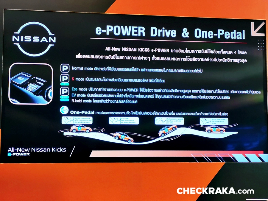Nissan KICKS e-POWER มาพร้อม 4 โหมดการขับคือ ปกติ (Normal Mode) เอสหรือสมาร์ทโหมด (Smart Mode) อีโค (Eco Mode) และอีวี (EV Mode) ที่ขับเคลื่อนด้วยพลังงานไฟฟ้าที่เหลือภายในแบตเตอรี่ โดยเครื่องยนต์จะไม่ทำงานจนกระทั่งแบตเตอรี่อยู่ในระดับต่ำ ให้ความเงียบและประหยัดสูงสุด