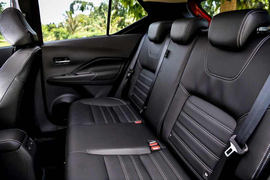 เบาะหลังส่วนพิงจะค่อนข้างตั้งตรง แต่เบาะรองนั่งสบายพอสมควร พื้นที่วางขาเล็กกว่าอัลเมร่าใหม่เล็กน้อย พื้นที่บนศีรษะเหลือเยอะ แต่ไม่ถึงกับโปร่งมากนัก ความสูงตัวรถกำลังดี ก้าวขึ้น-ลงสะดวก ไม่ต้องย่อตัวหรือโหนเมื่อเข้า-ออกรถ