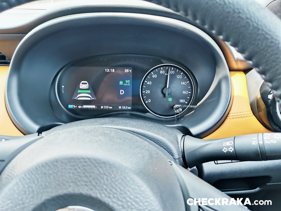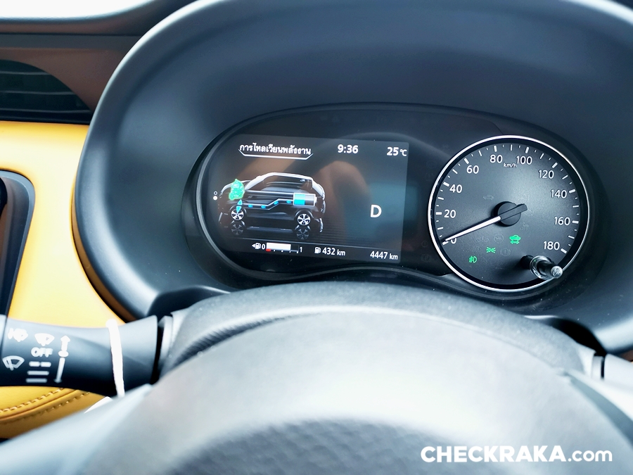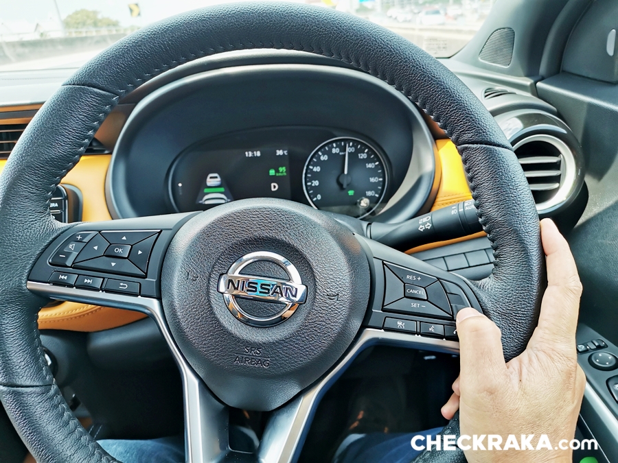 พวงมาลัยทรง "D-Shape" ท้ายตัดมัลติฟังก์ชั่นปรับได้ 4 ทิศทาง หุ้มหนังแท้แบบแข็งมือไปสักหน่อย แต่จับกระชับกำลังดี มาตรวัดล้ำมาก จอสี TFT 7 นิ้ว รูปแบบการแสดงผลแบบเดียวกับในนิสสัน ลิฟ อาจแตกต่างในรายละเอียดบ้างเล็กน้อย