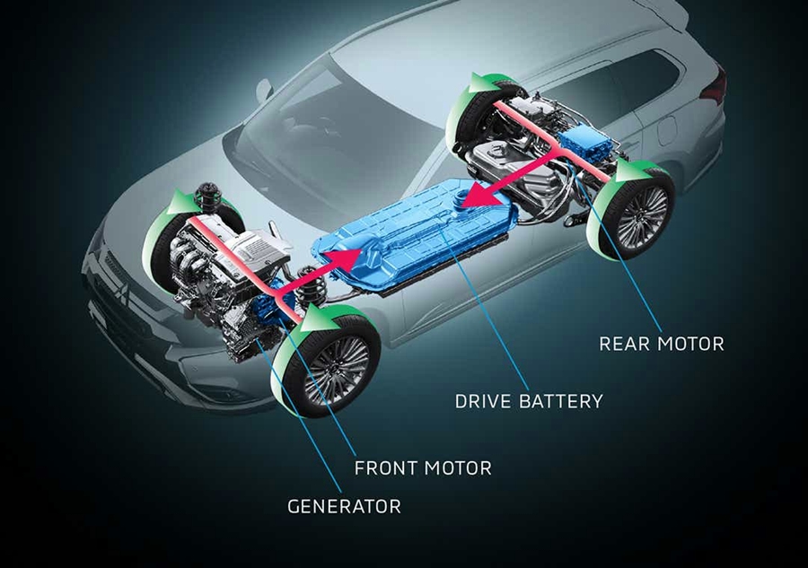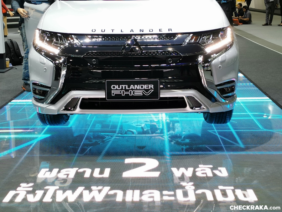 Mitsubishi Outlander PHEV รถยนต์ที่ใช้ได้ทั้ง 2 ระบบคือ น้ำมันและไฟฟ้า เมื่อชาร์จไฟรถยนต์จนเต็มสามารถวิ่งด้วยไฟฟ้า 100% ได้ไกลถึง 55 กม. ด้วยแบตเตอรี่ลิเธียมไอออนขนาดใหญ่ 13.8 กิโลวัตต์/ชั่วโมง