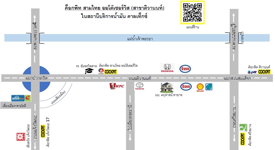 สถานที่ : 76/4 หมู่ 5 ต.บ้านใหม่ อ.ปากเกร็ด จ.นนทบุรี 11120 (จุดสังเกต: ตั้งอยู่ในสถานีบริการน้ำมันคาลเท็กซ์ บนถนนติวานนท์ จากห้าแยกปากเกร็ด มุ่งหน้าไปทางโรงเรียนอัมพรไพศาล 3 กิโลเมตร) โทรศัพท์ : 02-119-4607 เวลาเปิดทำการ : 8.00 – 20.00 น. ทุกวัน