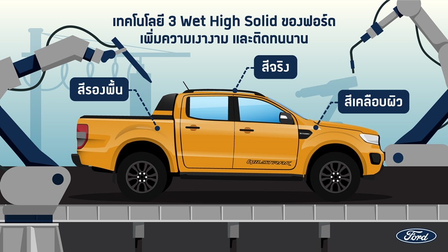 แน่นอนว่า รอยขีดข่วน สีแตกกระเทาะ และสนิม เป็นสิ่งที่ทำให้คนรักรถไม่สบายใจ สำหรับฟอร์ด นอกจากเราจะให้ความสำคัญกับมาตรฐานเรื่องสีรถเป็นอย่างมากแล้ว เรายังให้ความสำคัญในการทำให้สีรถติดทนนานเพื่อให้รถมีสีสันสวยงามตลอดอายุการใช้งาน ด้วยเทคโนโลยีการพ่นสีพิเศษแบบ 3 Wet (3-Wet Paint Technology) หรือการพ่นสีทับกัน 3 ชั้น และอบสีเพียงครั้งเดียว โดยสีที่ใช้เป็นสารเคมีที่มีความเข้มข้นสูง จึงทำให้มีพื้นผิวหนาและแข็งแรงมากยิ่งขึ้น ทนทานต่อการขีดข่วน การแตกกระเทาะและป้องกันการกัดกร่อนของสี ทำให้สีมีความเงางาม และมีความหนา คงทนได้นานขึ้นถึง 56 เปอร์เซ็นต์