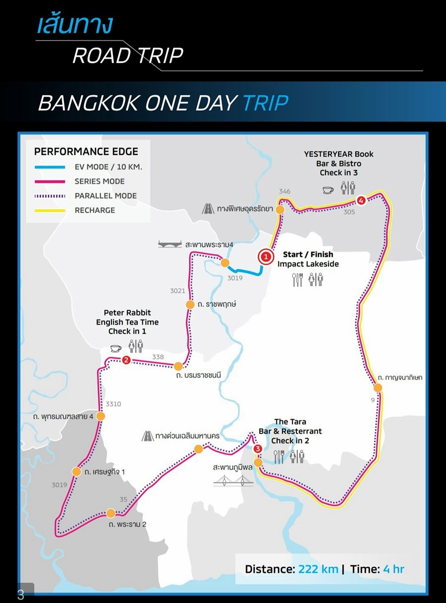 จากการขับทั้งทริปเริ่มต้นจากลานริมทะเลสาบเมืองทองธานี สะพานพระราม 4 ถนนบรมราชชนี พุทธมณฑลสาย 4 พระราม 2 สะพานภูมิพล ถนนกาญจนาพิเษก รังสิตองครักษ์คลอง 6 และกลับสู่จุดเริ่มต้น รวมระยะทางรวม 222 กม.