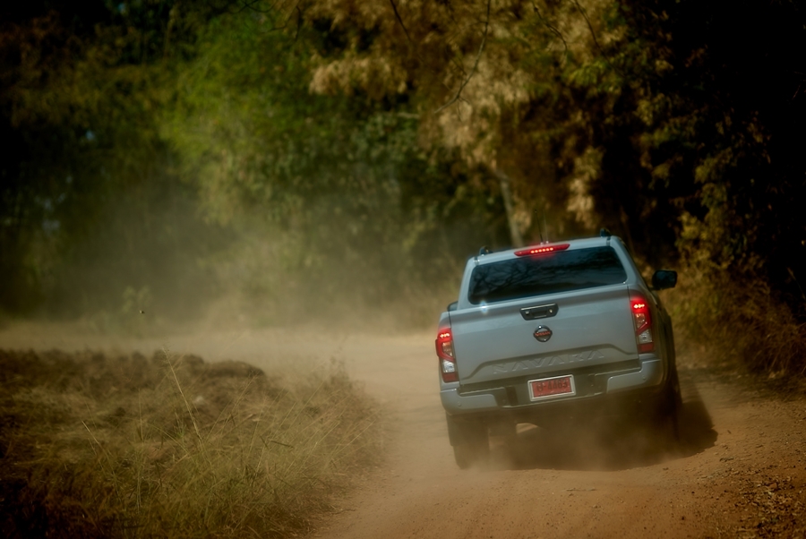 พร้อมแล้วกดปุ่ม Engine สตาร์ทและออกเดินทางกัน การขับขี่ทริปนี้เป็นแบบ ฟรีรัน ทางทีมปักพิกัดไปที่ไร่สวยๆ แห่งหนึ่งในจังหวัดกาญจนบุรี โดยใช้การเชื่อมต่อ ios เข้ากับหน้าจอของรถ เพื่อให้สามารถดูแผนที่ Goolgle Map ได้ที่หน้าจอสัมผัสขนาด 8 นิ้ว ได้ชัดๆ ไม้แรกลองเป็นผู้นั่งที่ดี สังเกตุการณ์สัมผัสความนิ่มนวลของช่วงล่าง นิสสัน นาวารา DC 4wd VL 7AT รุ่นท๊อปที่จัดเต็มมาทุกระบบ และไม่มีการเซทใดๆ เรียกง่ายๆ ว่ามาจากโรงงานใหม่ๆ ป้ายแดงที่ยังมีกระเด้งกระดอน ตามสไลต์กระบะที่มีตับแหนบแข็งกระด้างบ้าง แต่ให้ความนิ่มนวลกว่ารุ่นเดิม และที่สัมผัสได้ชัดเจนคือห้องโดยสารที่เงียบ เสียงเครื่องยนต์แทบจะไม่ค่อยได้ยิน เพราะด้วยการบุวัสดุภายในห้องโดยสารที่ทำให้เก็บเสียงได้ดีเยี่ยม ที่นั่งด้านหลังกว้างขวาง นั่งสบาย มีระบบปรับอากาศเย็นฉ่ำแยก ถือว่าเป็นกระบะที่ใช้งานได้ทั้งครอบครัวเลยจริงๆ