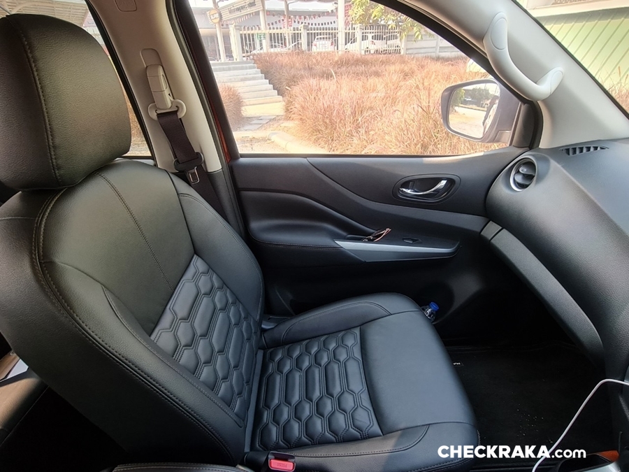 ในส่วนภายในเปิดประตูเข้ามาก็ต้องว้าวววว เพราะสิ่งที่สะดุดตาคือลายเบาะหนังที่แอบคิดในใจว่าเราจะมาขับกระบะจริงๆ หรือเนี่ย เพราะดูหรูหรา แปลกตากว่าที่เคยเห็นในกระบะรุ่นอื่นๆ เบาะเป็นหนังอย่างดี แถมเบาะคู่หน้ายังออกแบบด้วยนวัตกรรม Zero Gravity ทำให้สามารถรองรับกับแนวกระดูกสันหลัง ตามหลักสรีรศาสตร์ รวมถึงยังเพิ่มความสะดวกด้วยที่วางแขนและแก้วน้ำด้านหลังอีกด้วย