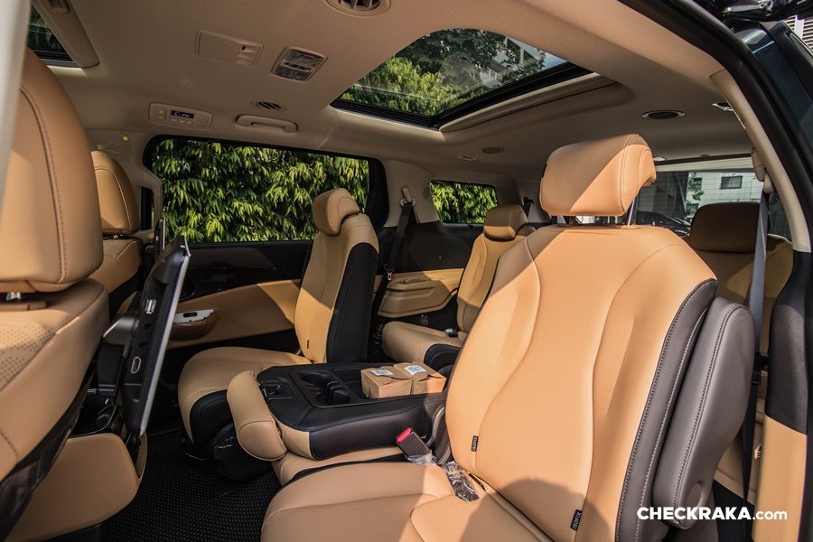 ส่วนแอร์หลังมีปรับได้ทั้งที่ในส่วนหน้าคอนโซล และส่วนหัวด้านบนฝั่งหลังคนขับ จุดชาร์จ USB จำนวน 6 จุดบริเวณคอนโซลด้านหน้า ด้านข้างของเบาะคู่หน้าและบริเวณที่นั่งแถวที่ 3 ประตูสไลด์ไฟฟ้า Smart Power Sliding Door พร้อมระบบ Smart Entry ที่ประตูสไลด์จะเปิดเอง เกีย คาร์นิวัล 2021 รองรับผู้โดยสารได้สูงสุด 11 ที่นั่ง โดยเบาะแถวที่ 4 แบบ Pop-Up Sinking ที่พับเก็บได้ราบเรียบและง่ายดาย เพิ่มพื้นที่สำหรับเก็บสัมภาระได้มากกว่า เบาะคู่หน้าปรับด้วยไฟฟ้าพร้อมระบบดุนหลัง 4 ทิศทาง (2 ทิศทางสำหรับรุ่น EX) เกียร์หมุน Dial Type - Shift by Wire พร้อม Paddle Shift* ม่านบังแดดประตูสไลด์และด้านข้างของเบาะแถวที่ 3 ถุงลมนิรภัยรอบคัน รวม 7 จุด คู่หน้า ด้านข้างเบาะคู่หน้า บริเวณหัวเข่าของผู้ขับขี่ ม่านนิรภัยรอบคัน ระบบเซ็นเซอร์ช่วยจอดหน้า-หลัง Parking Distance Warning (PDW) พร้อมกล้องรอบคัน Surround View Monitor (SVM)